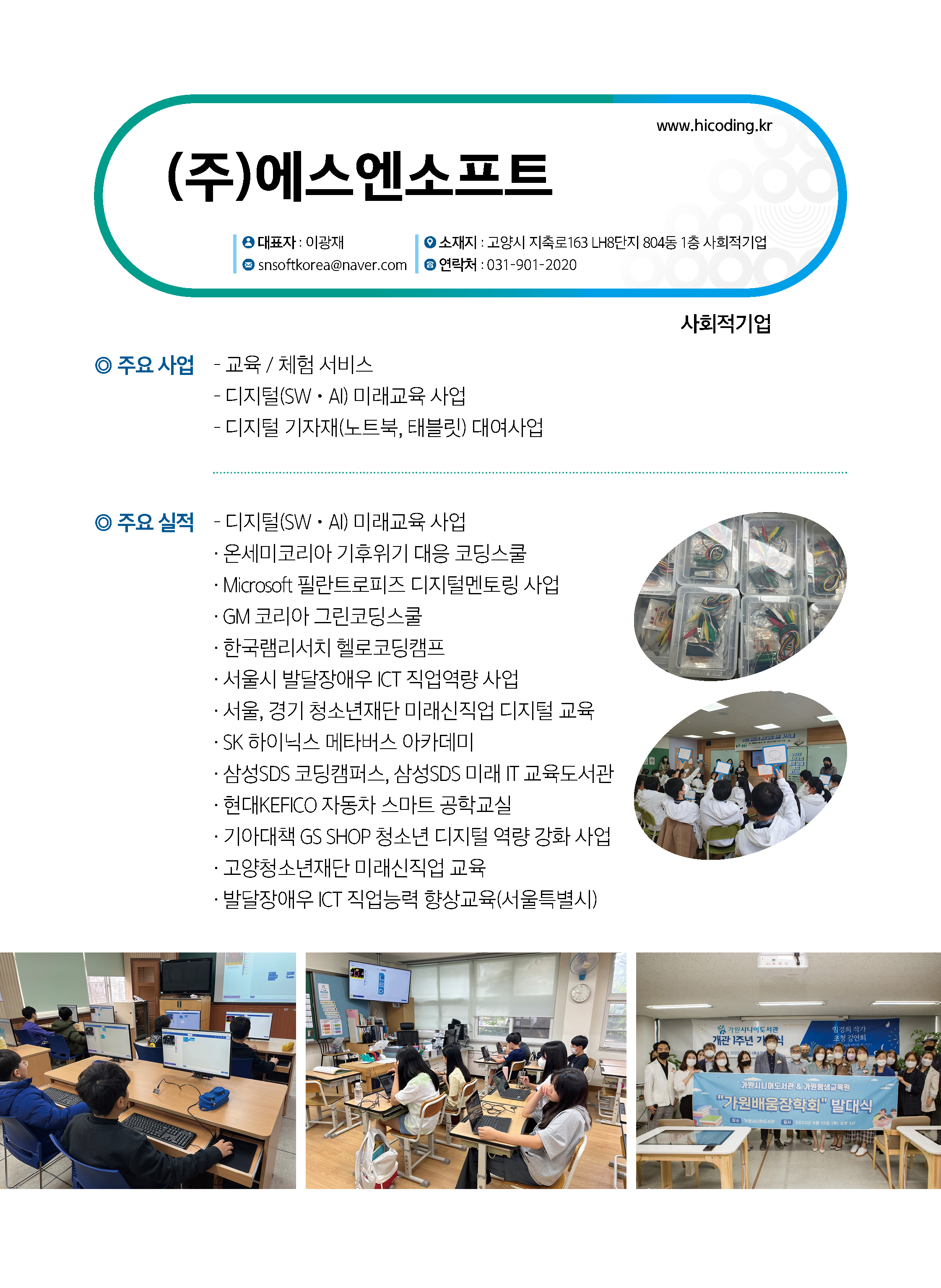 에스엔소프트 - 교육/체험 서비스, 디지털 미래교육, 디지털 기자재 대여 최고관리자 0 115 2024.06.21 09:31 (주)에스엔소프트 - 교육/체험 서비스, 디지털 미래교육, 디지털 기자재 대여 에스엔소프트 홈페이지 www.hicoding.kr