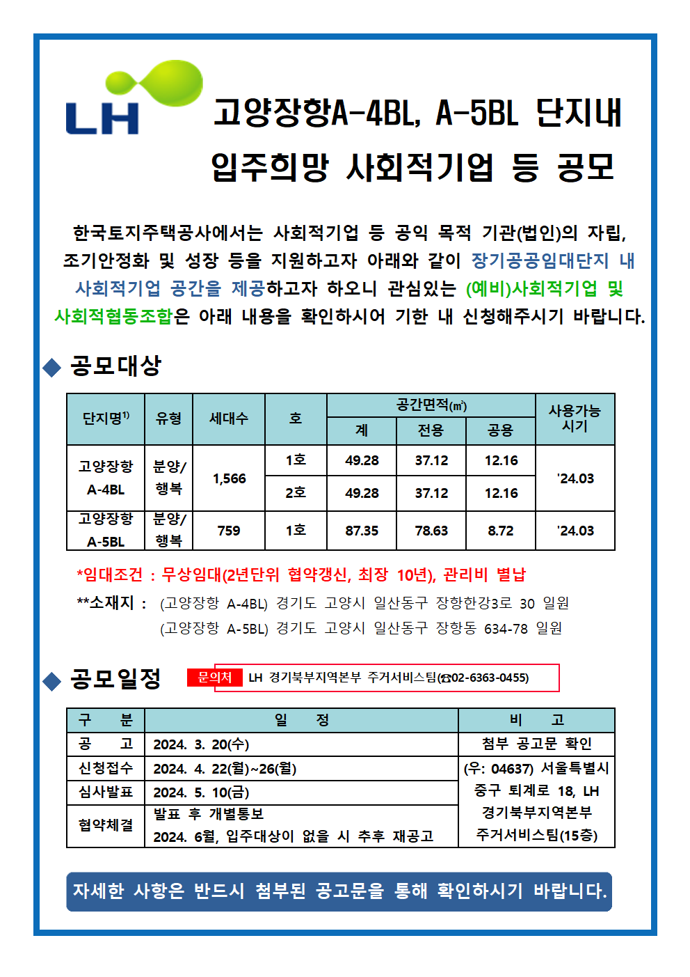 고양 장항 A-4BL, A-5BL 단지내 입주희망 사회적기업 등 공모