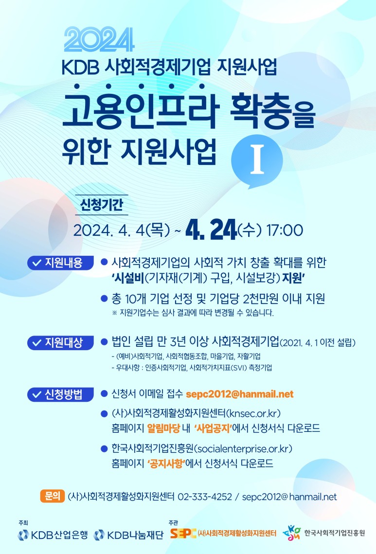 2024년 KDB 사회적경제기업 지원사업 『고용인프라 확충을 위한 지원사업 Ⅰ』모집 공고