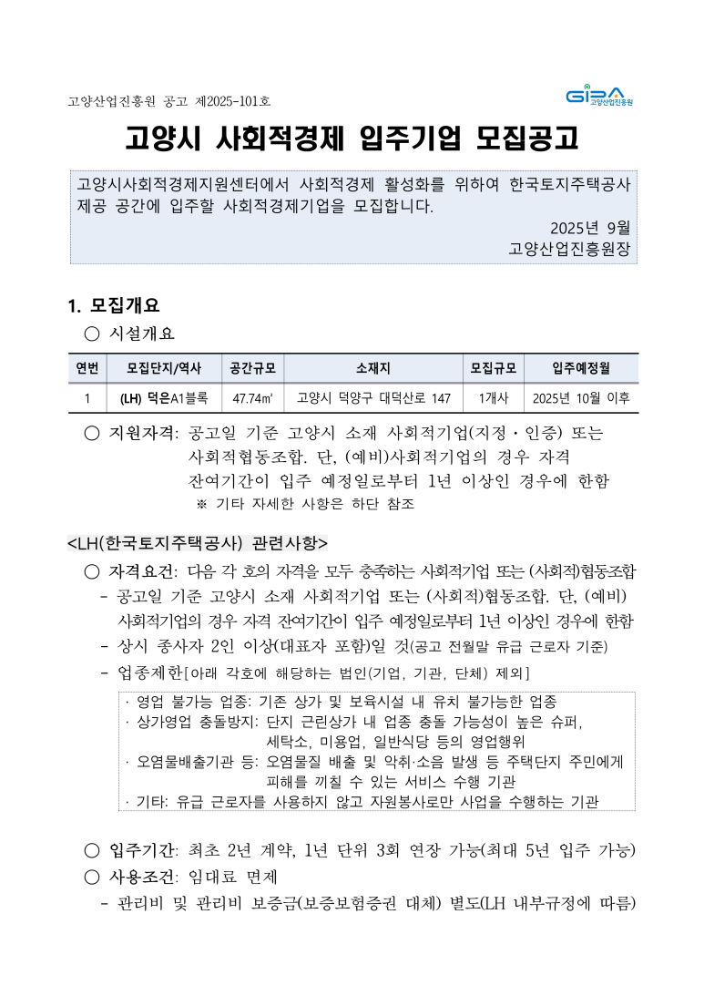 고양시 사회적경제 테마스테이션(덕은A1블록) 입주기업 모집(~9월 25일 15시까지)