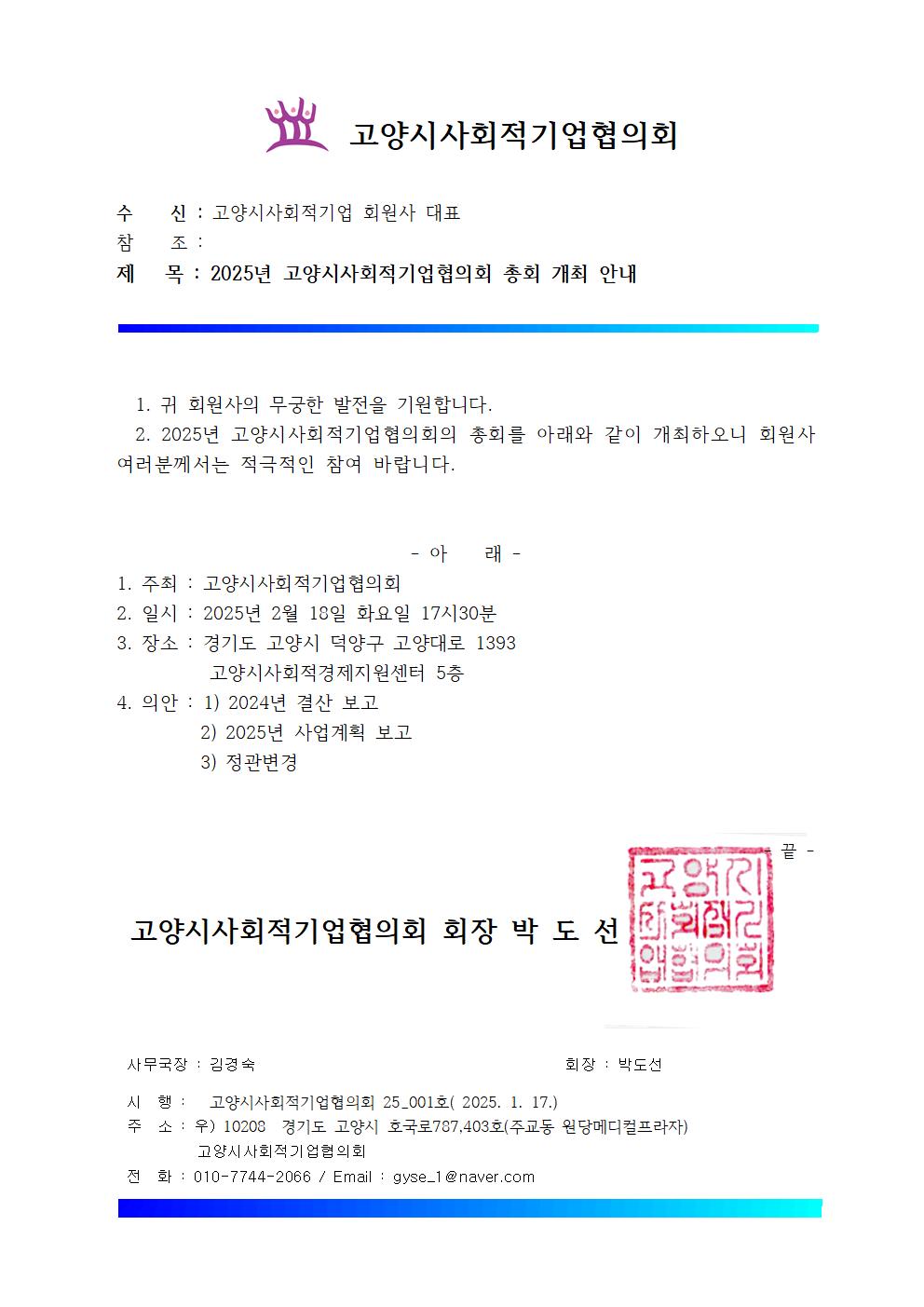 2025년도 고양시사회적기업협의회 정기총회가 오는 2월 18일(화) 17시 30분 고양시사회적경제지원센터(5층)에서 개최됩니다.