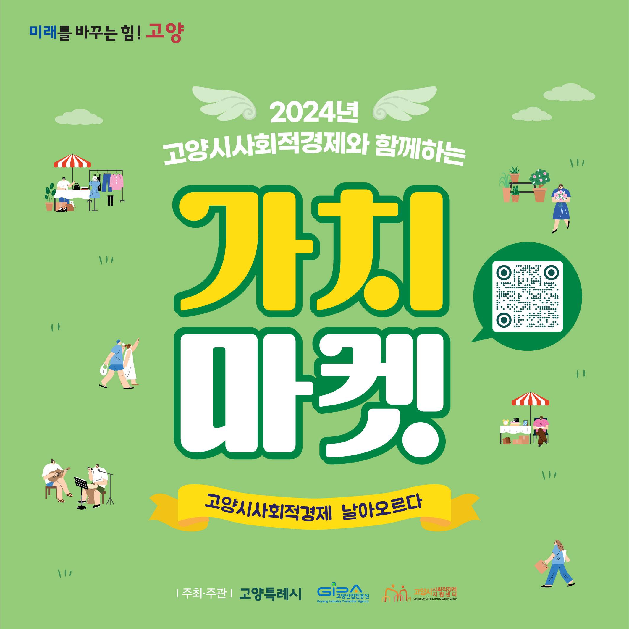 고양시가 사회적경제 생태계 활성화를 목표로 2024년 '가치마켓'을 일산문화광장 고양관광정보센터 인근에서 운영한다. 올해는 두 차례 열릴 예정이며, 1차 행사는 사회적경제 주간을 맞아 7월 6일(토), 7일(일) 이틀 간 진행되며, 2차 행사는 10월 5일(토), 6일(일) 진행될 예정이다.