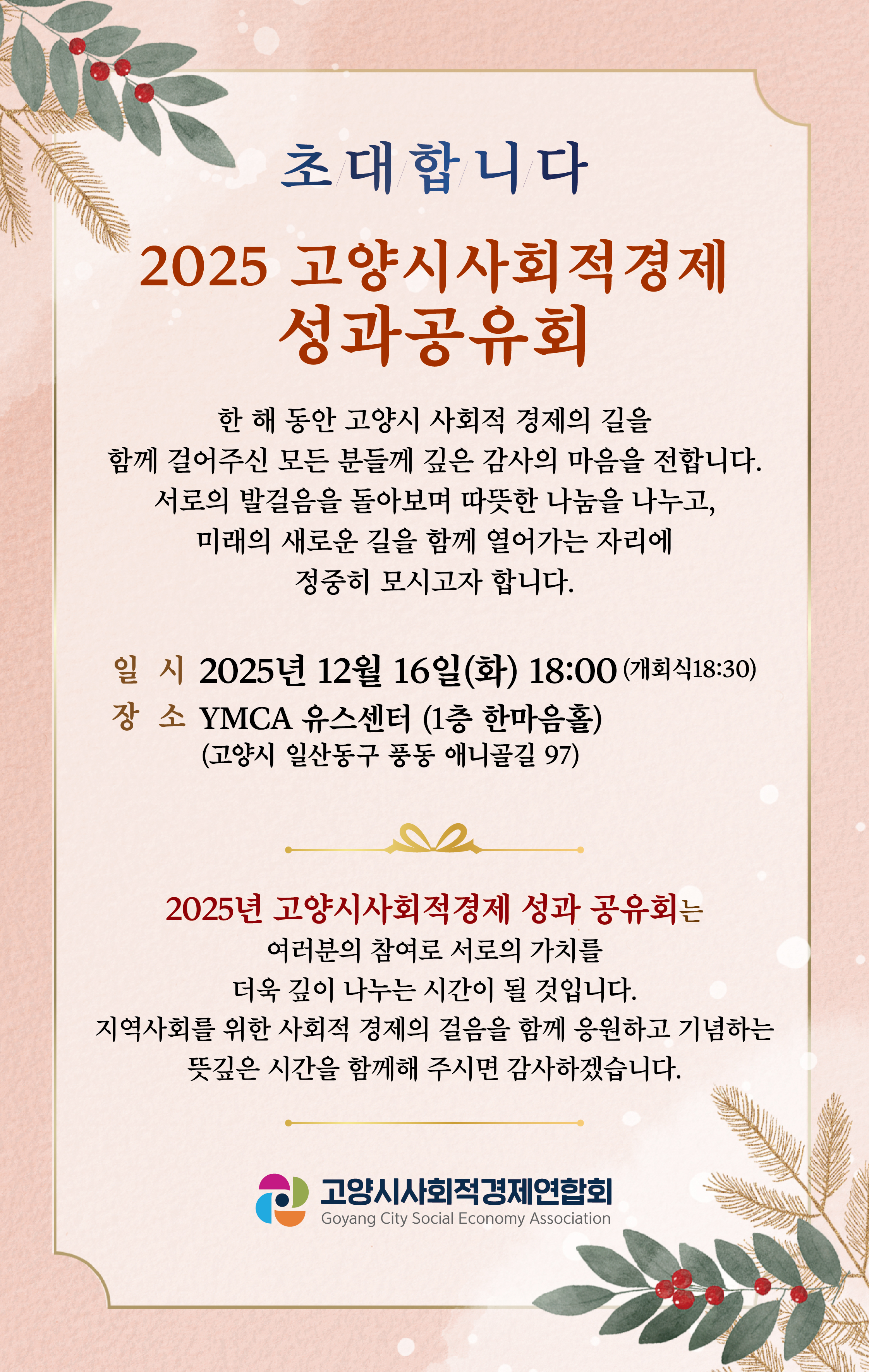 고양시사회적경제연합회(회장 박도선)는 오는 12월 16일 YMCA유스센터(풍동 애니골길 97) 1층 한마음홀에서 '2025 고양시사회적경제 성과공유회'를 개최한다.