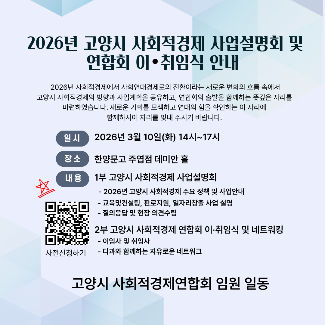 ○ 행사명: 2026 고양시 사회적경제 사업설명회 및 연합회 이·취임식