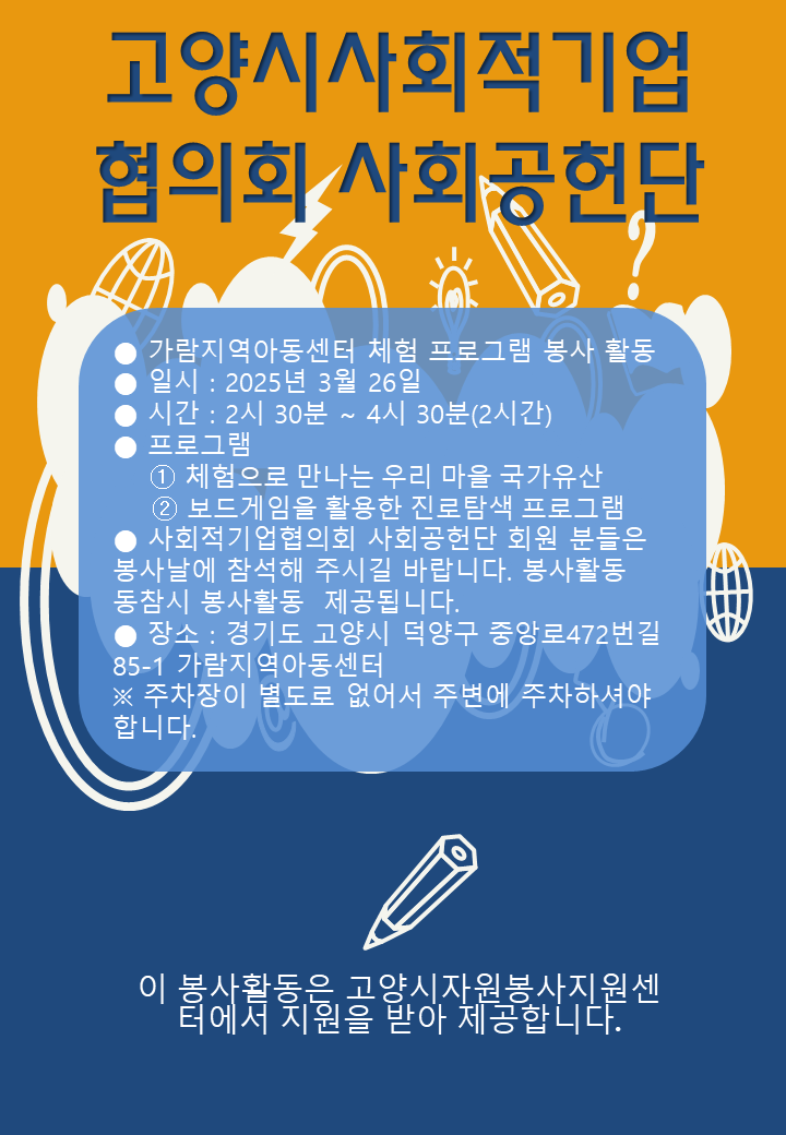 고양시사회적기업협의회 사회공헌단에서 진행하는 봉사활동에 자원봉사자를 모집합니다.