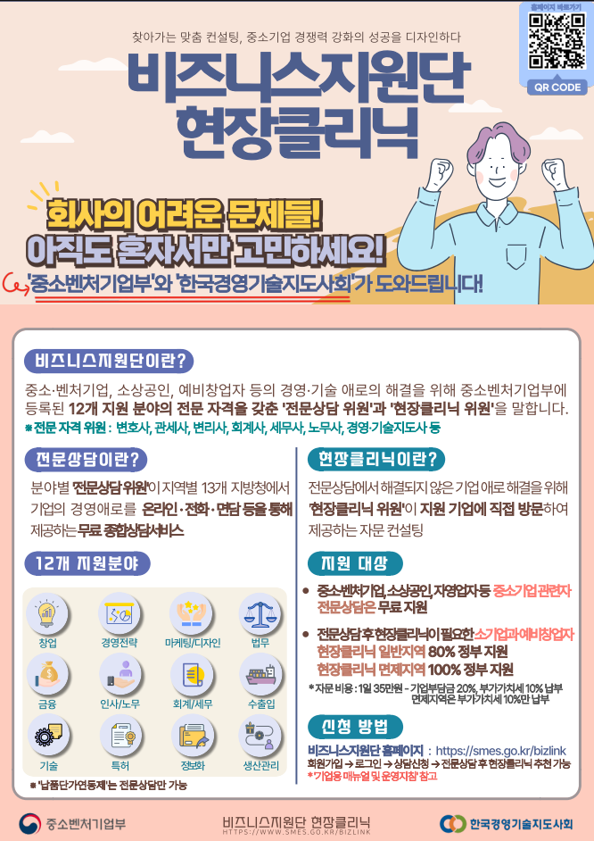 비즈단은 12개 분야 전문위원이 중소•벤처기업, 소상공인, 예비창업자를 위한 무료 자문상담을 제공해드리는 프로그램으로(매주 월, 수, 금 9시~18시 / 허브 회의실1), 현장 방문하시면 별도 예약 없이 상담 받으실 수 있으십니다.
