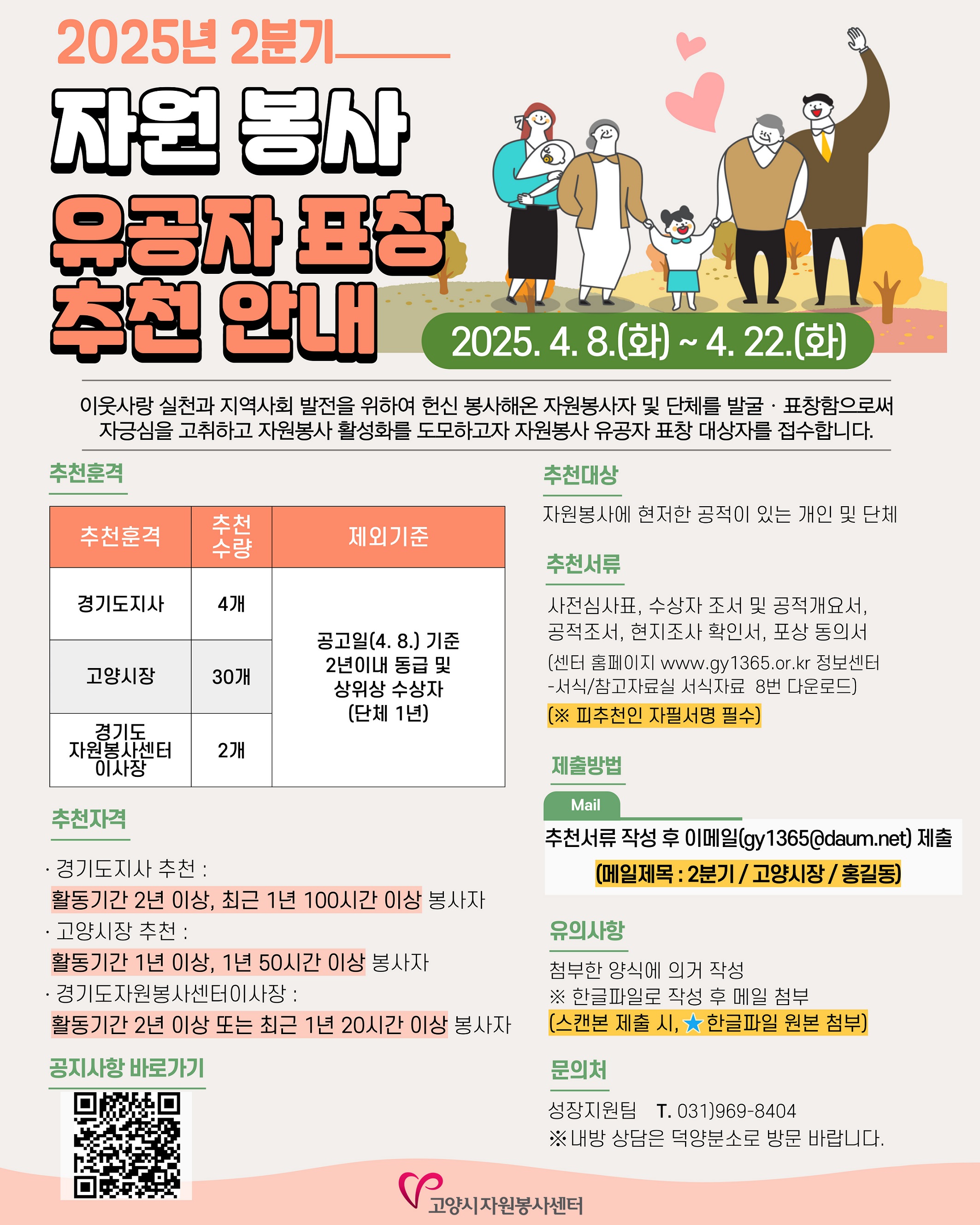 고양시자원봉사센터는 2025년 2분기 자원봉사 유공자 추천을 받고 있습니다.