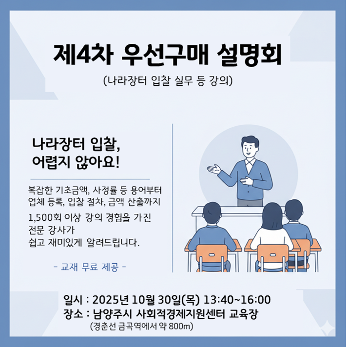 나라장터 입찰 실무 등 우선구매 설명회가 오는 10월 30일 13시 40분 남양주시사회적경제지원센터에서 열린다.