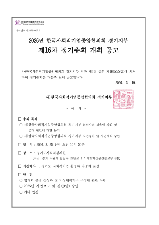 한국사회적기업중앙협의회 경기지부(경사협)는 오는 3월 25일(수) 10시 경기도사회적경제원(수원시 팔달구 효원로 1, 사회혁신공간 팔로우) 8층에서 제16 차 정기총회를 실시한다.
